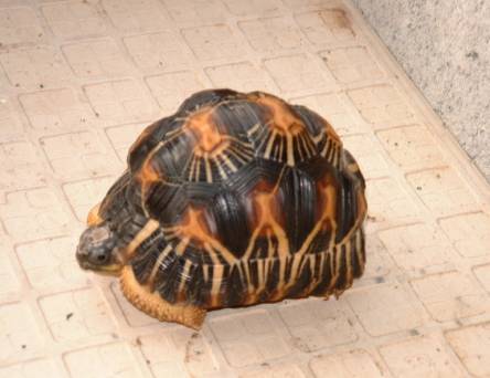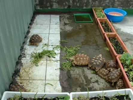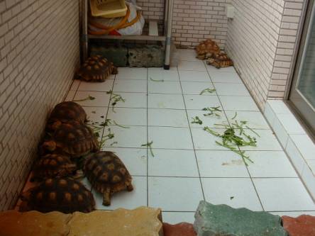 五、混養問題 2001年底我擁有8種12隻有大有小的陸龜,但空間只有陽台約四坪大。一個冬天下來,把我給累慘了,有些物種要乾燥﹝豹、星、蘇﹞,有些要潮濕﹝紅腿、黃頭、靴腳﹞,有些具攻擊性﹝賀曼﹞,有些則很害臊﹝星﹞,有的大隻﹝蘇22公分﹞,有的小隻﹝5公分﹞實在煩惱,經過這漫長冬季後,自己也重新定位,決定只養一種就好,就忍痛將愛龜分別與其他龜友交換,經有計劃交換後,現在我只留元老級的小星及四趾,其牠都換光了!