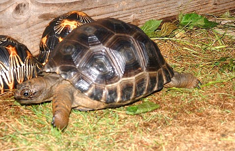 頻頻走避! 我很希望牠能一直這樣羞澀下去,直到巨大!因牠會以快速走避來移動,屆時要溜龜才有可能!(不像動物園的龜一動也不動!怎麼溜!) 目前將之與幅射龜飼養一起,並無不妥!牠們吃的食物、與原生環境類似!