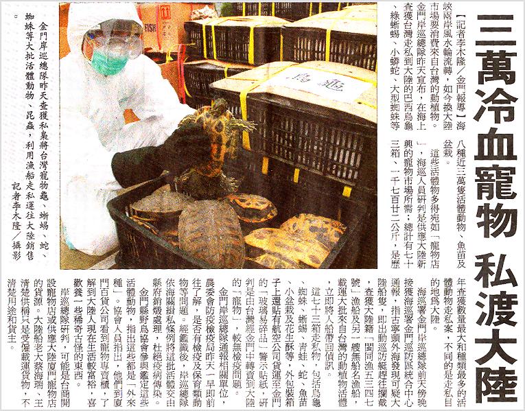 相對於委內瑞拉的保育活動,台灣的保育活動就少得多了.倒是動物走私的消息比較多.在聯合報刊出委內瑞拉放生活動的第二天,就刊登了一宗走私爬蟲遭查獲撲殺的消息,可說是滿強烈的對比■