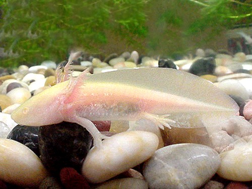 白化六角恐龍可以人工強迫進化為陸棲的白化墨西哥蠑螈 |