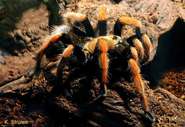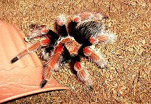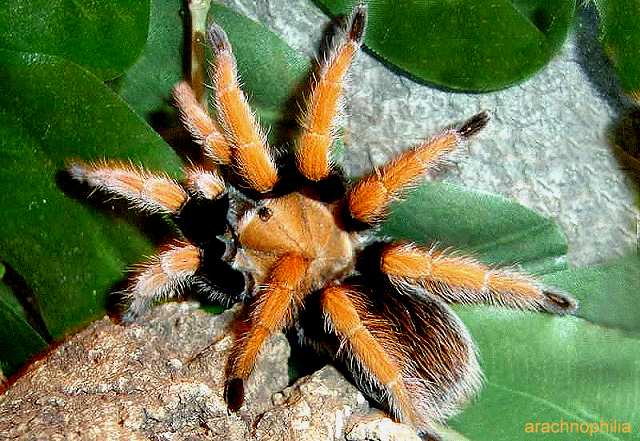至於墨西哥血腳和墨西哥火腳就比較難分辨了.基本上由體型來分辨比較容易,因為墨西哥血腳的體型比較小,而墨西哥火腳是Brachypelma屬比較大的種類,最大體型可
