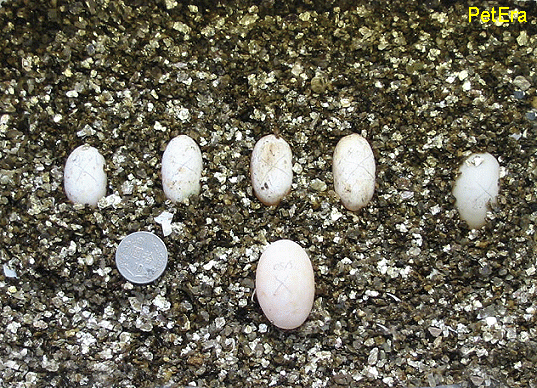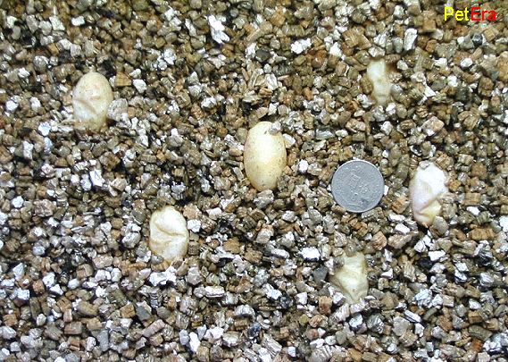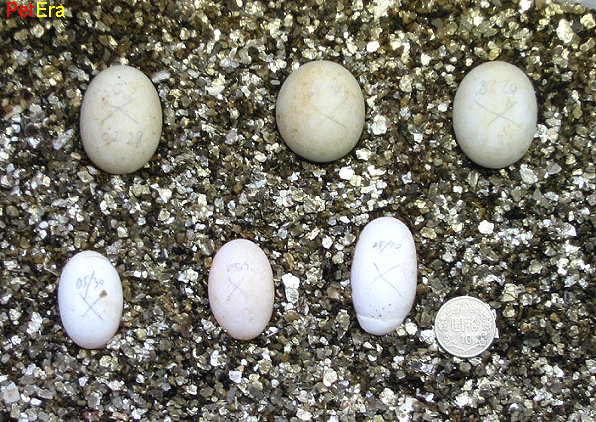 上排櫻桃蛋,下排三顆星龜蛋中央那顆未白化顯然未受精 |