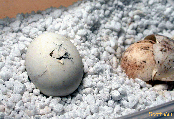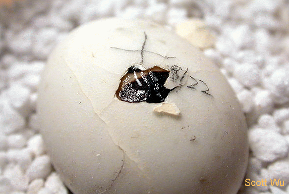 在西雅圖的Scott繼第一顆蛛網蛋在去年孵化後,第二批兩顆蛛網蛋相差五天也相繼在今年四月份孵化.其中一顆與去年那顆一樣費時九個月,而另一顆只孵了八個月,由照片看來大小似乎沒有差異.不