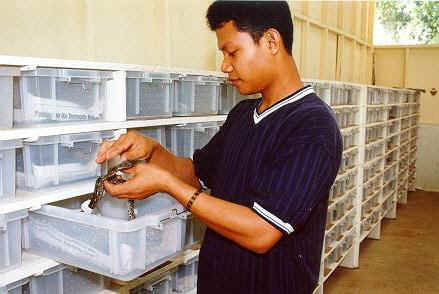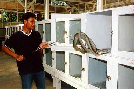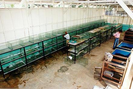 - 比較起來,東南亞的繁殖場就比較專注於稀有而高價的種類,規模也比較小,主要是供應鄰近的亞洲國家.因為氣候適中,所以設備也比較簡單,這家繁殖場是以繁殖蛇類為大宗,龜龜則以棕靴,黃頭,豬鼻等本土種為主,其他巨蜥,老爺樹蛙,守宮,蜥蜴等都有繁殖,比較特別的是哺乳類的懶猴和眼鏡猴也能量產,台灣有許多物種都是直接或間接來自於這家繁殖場.