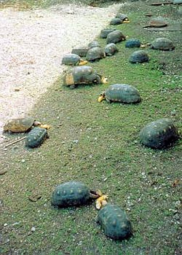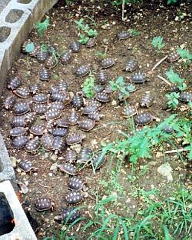 紅腿象龜在台灣也是屬於人氣龜種,位於加勒比海的繁殖場每年輸出數百隻到亞洲國家,數量算是比較有限.此繁殖場採取較粗放式的繁殖,所有種龜都放養在一片寬廣的場地上.並沒有特別的人工設施,這或許