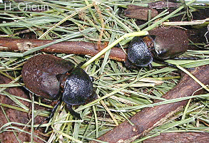 雌性成蟲並沒有雄蟲的犄角,體型也較小.而雄蟲 交配後一個月左右就會死亡.雌蟲在交配後2-3週就會產卵數次,產卵的底材與飼養幼體的底材相同但是要緊密壓實,雌蟲會鑽入土中產卵,每次產下約7-10顆卵.經過5-6週之後就可以小心將底材挖開尋找孵化的幼蟲.當然也可以在產卵後兩週將卵移出,每顆卵單獨用布丁盒孵育.大體上來說,只要注意保持穩定的飼養環境,要繁殖南洋大兜蟲的難度並不高.繁殖成功的喜悅也是一種無比的享受.