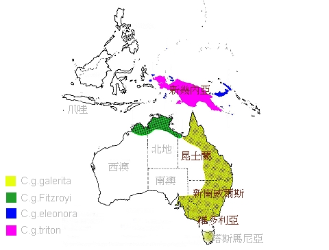 產於澳洲北部,冠羽較長,眼後無黃斑,眼圈為淺藍色.
