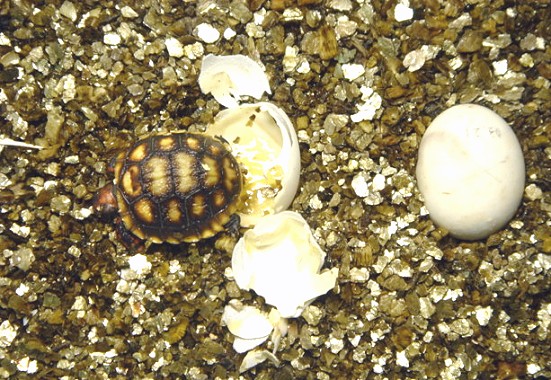 當初雌龜所產下的四顆蛋中一顆未受精淘汰,一顆過早開蛋檢視後來並未救活,一顆孵化,現在還剩一顆尚在孵育中,若正常的話,應該在一週內會孵化.
