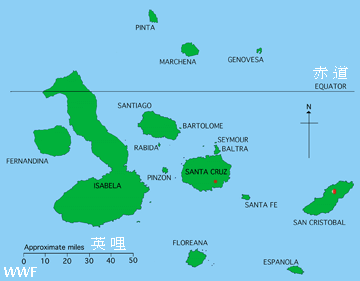 加拉巴哥群島位於厄瓜多爾西岸外1,000公里的太平洋上.橫跨在赤道上.總共由13個大島,6個小島還有107個小礁石組成,總陸地面基是8,000