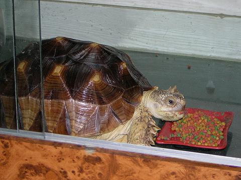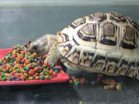 目前蘇卡達腹甲已經25cm,生長紋路很明顯,將來的生長速度會很樂觀喔!但豹就要加油啦!因為蘇比豹大多了,每次放飯時,都要分開餵食,以免豹被流氓蘇欺負!!!和大家分享些豹和蘇吃飼料的照片,希望大家的愛龜順利長大。