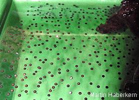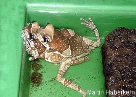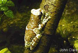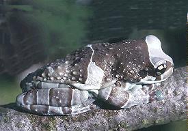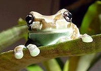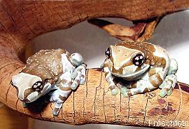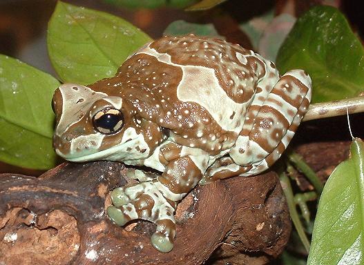 棕白保護色.體型上也屬於大型的樹蛙,比紅眼樹蛙來的更大更厚實.也是夜行性的蛙類.牛奶蛙背上佈滿白色疙瘩,在遭受威脅時會分泌出乳白色類似牛奶的微毒液體,嚇阻掠食者的攻擊,所以被命名為牛奶蛙.其實就以牠們的體色來說,就已經很像咖啡上加了牛奶一樣,也很像乳牛的花紋,造物者的神奇展現無遺.
