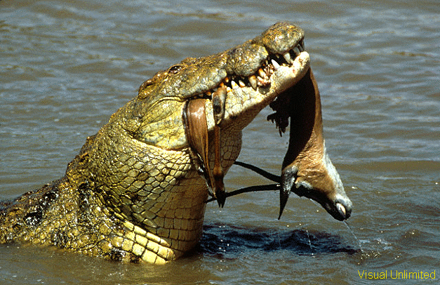尼羅鱷擁有超大的胃口以及超強的胃酸,加上大嘴利齒,可以說是標準的掠食動物,整隻羚羊一口吞下後連角,骨頭,蹄都可以完全消化,進食後可以一個月都不吃.雖然沒有天敵,但是因為適合製作上等鱷皮,因此在保育之前也是大量遭到獵殺.目前數量下降的趨勢已經舒緩許多.