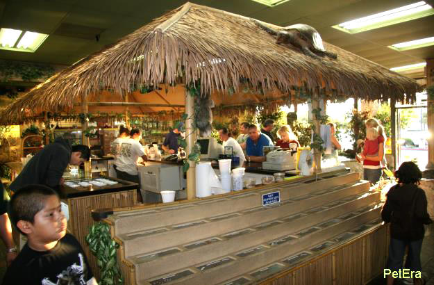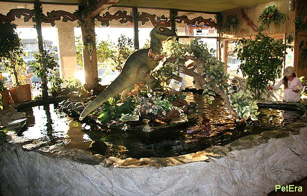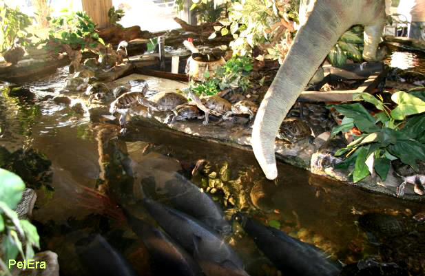 店內的水龜池與台北爬蟲館的水龜池類似,展示的都是一般北美水龜種類如巴西龜,紅肚龜等,水中則養了許多巨型銀板魚,可能與這家點原本是水族店有關,當初店主裝潢時就考慮到教育功能,所以這家爬店其實也滿類似動物園的形式.連櫃檯也設計成非洲式茅屋,的確