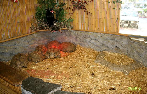 Pets首先就看到旁邊圈養的大蘇卡達,其中一隻看到站長靠近,還馬上走過來招呼,滿好客的.牠那種巨大的質感與一般小蘇當然是截然不同的.店外面的空曠剛好與店裡面的人潮形成對比,除了在參觀的顧客之外,還有約20位的親子團大人小孩在店內佈置的