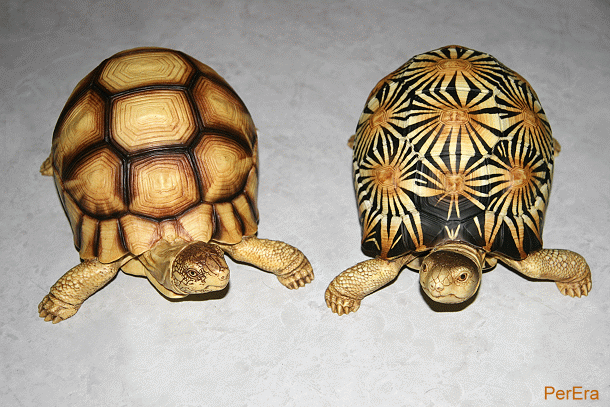 近來在市面上出現了一種陸龜模型,可以說已經達到仿真的程度,在形意上的表現,雖然未臻完美,不過至少是其他作品所難以超越的.站長認為陸龜模型最難做的部份在於龜甲的紋路和色彩其次就是姿勢.以這一款太陽輻射龜模型來說,在龜甲紋路上毫無缺點,因為它是用真正的龜