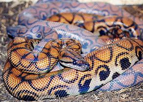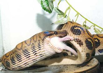 交配中之巴西彩虹蟒雌性即將蛻皮 |