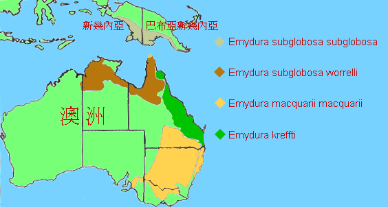 澳洲主要的龜類分別屬於側頸龜科和蛇頸龜科兩大類.側頸龜科中最主要的就是 澳洲側頸龜屬Emydura,這一屬共包含了六個種類: