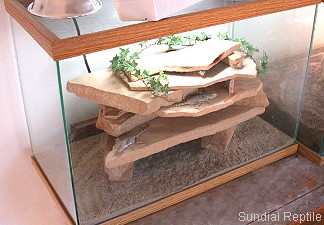 在飼養環境上應該以沙為底材,並堆上多層岩板製造石縫供牠們躲藏.因為蜘蛛守宮同樣有日行的傾向,所以也是要設置紫外線燈光.水盆可以不用,但是每週最好噴水2-3三次,牠們會舔食岩石表面的水滴.食物以蟋蟀和麵包蟲為主.幼體可以餵食螞蟻蟋蟀.