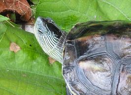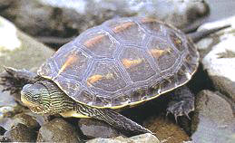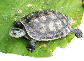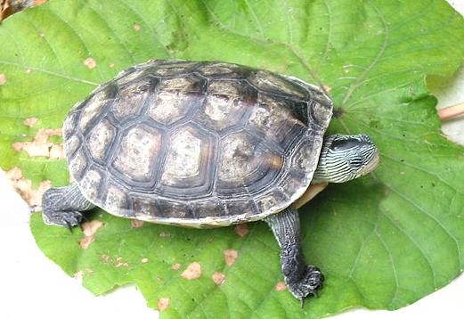 頭部滿佈條狀斑紋是斑龜之名的由來                                         斑龜成龜體型修長