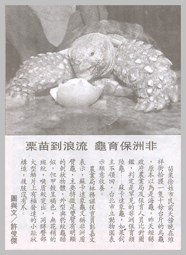 保育類爬蟲開放到現在,終於在報紙上出現了第一隻遭到棄養的蘇卡達象龜.這是聯合報七月二十日的報導,由圖片看來,這隻大蘇應該超過30公分,這種尺寸的蘇卡達一天吃的青菜會比一家四口人吃的還多很多,所以台灣出現棄養