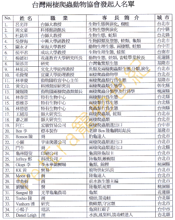 發起人因為參與踴躍,超過了預定人數,總共達到了35位,分布在11個縣市,主要分為兩大族群,學者專家佔18位,達人佔17位.可以說涵蓋了國內主要的兩棲爬蟲學者專家業者達人,雖不敢說是夢幻陣容,應該也算是黃金打線.站長認為如果要增修兩爬類法令,制定兩爬類保育政策等等,將來的兩爬協會應該會比野生動物保育諮詢委員會更具代表性與公正性.協會