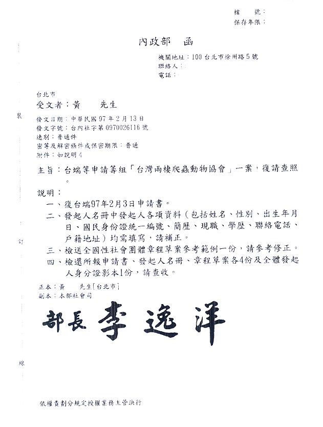 相對於協會的順利發起,協會的申辦就是一個對比了,內政部承辦大人的處理效率很高,退件效率更高.站長在過年前兩天親自送交內政部.初六(12日)早上便接到承辦