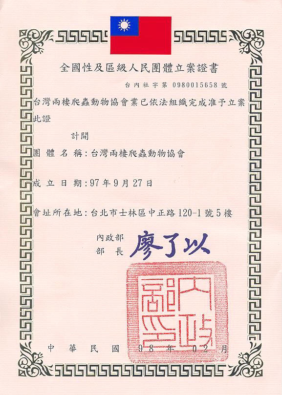 準備完補件資料,再次於農曆年前送出,農曆年後又接到補件電話,所幸這次只是修改部份文字,一切搞定之後,終於在二月六日接獲內政部審定的兩爬協會立案證書,從此,協會合法立足台灣.台灣的兩棲爬蟲事