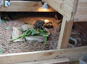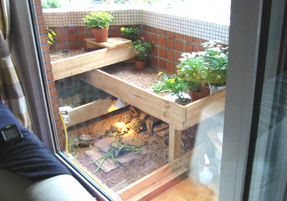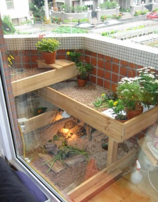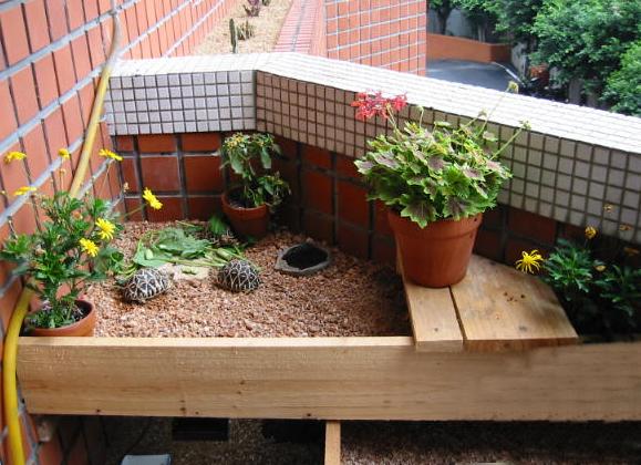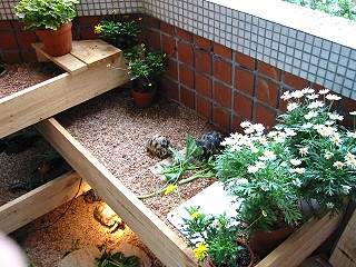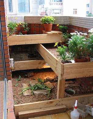 KK 2004.05.11. 在台灣,龜龜大戶養龜,龜窩通常設在三個地方,陽台,頂樓,和庭院.設在陽台的相信超過半數,不管是前陽台或是後陽台,空間總是很侷限的,永遠不夠用.但是,只要經過簡單的設計,空間 還是可以創造的.如果你只有一個陽台,又已經混養了許多龜龜,或者是打算多養一些龜龜時,就必須創造更大的空間,如果因為空間倍增而造成府上龜口暴增,荷包暴縮可是與本站無關的喔.同時也希望有其他更高明龜窩設計的龜友可以大方的Show出來分享給大家. 由於龜龜是在平面活動的動物,因此若要創造空間,最簡單的辦法就是增加平面,換句話說,就是向上發展,蓋樓房.下面圖示的龜窩基本上是四層樓的建築,每一層飼養一個龜種,由於陽台朝東,必須考慮日照的方向和角度,盡量做到每一層樓都可以曬 得到陽光.因此,龜窩必須以L型重疊,才不致於遮敝下層的陽光. 構思完成後再測量出正確的尺寸,畫出簡單的設計圖,最後根據設計圖購買需要的材料.陽台龜窩必須考慮風吹雨打的自然條件,所以選用了最經濟最實惠又容易加工的木質材料,多年下來,證明木板的耐水性十分良好.基本上龜窩的長與寬是170cm X 105cm,計算過需要的木板數量與尺寸,到B&Q一次買足,總材料費包括木料,加上鐵鎚,鐵釘鋼釘鋸子等工具不到1,500台幣.施工由釘角料開始,先把角料用鋼釘釘入陽台牆壁,做出支架,再釘上木板,由底層往上層釘,前後三個工作日就大功告成.最後舖上底材,水盆,盆栽,一個 自然舒適的龜窩就誕生了. 夏季時陽光可以直接曬到龜窩,雨淋的機會很少,只有在颱風時,才會濺到較大的雨水,颱風過後不久就會自然風乾,不治於會有積水的問題.冬季時,底材下面鋪設T-rex加溫墊,每層樓都裝設1-2盞100WUVB燈泡,然後整個龜窩用透明塑膠布完全罩住,是整個龜窩變成一座溫室.在10度低溫的情況下,溫室內的溫度還能保持在23度左右. 當然,這種複合式的設計概念不僅只能用在陽台,在任何地方都可以沿用,特別是用在大量養殖幼龜時最為方便有效.只要稍微用點心,你的龜窩也可以是這樣子的.