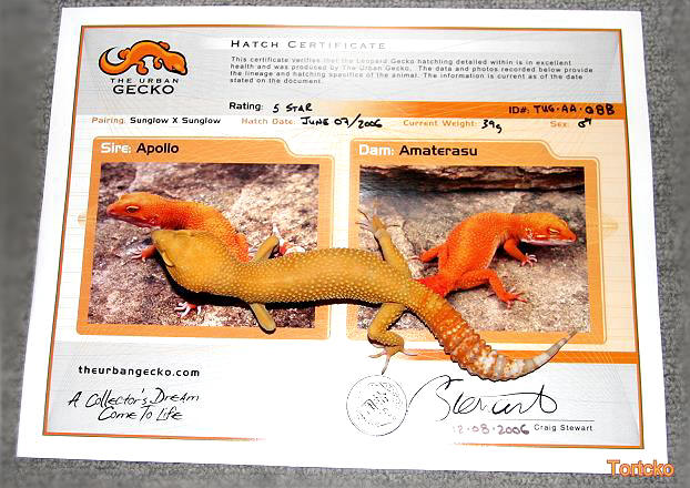 Sunglow陽光豹紋的玩家一定很想知道UG所用的白化豹紋是三種白化中的那一種.站長也親自與在電話中請教過UG,牠們也很大方的證實,他們用的白化豹紋就是Tremper白化豹紋!這對台灣佔絕大多數的Tremper豹紋來說是最理想的.他們使用Tremper豹紋的原因有兩個,一是Tremper白化豹紋數量最多,是市場主流;二是Tremper白化豹紋會比其他兩種更能夠保持親體的色澤.這種精細的考量,正是台灣所欠缺的.