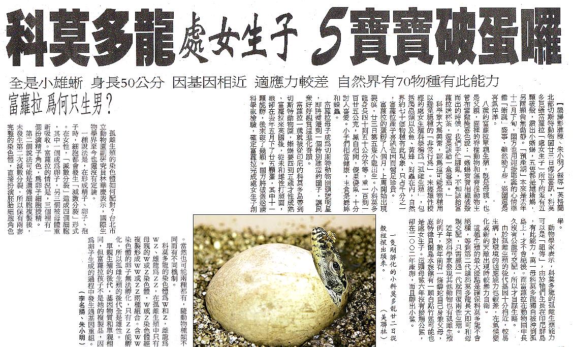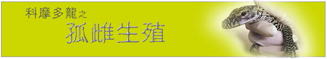 在2006年5月間,英國生物界證實了一件重大發現,那就是全世界最大的蜥蜴,科摩多龍,竟然可以孤雌生殖,也就是不需要雄性就可以無性生殖.這個發現震驚了全世界的學者專家.也不禁讓站長想起,在侏儸紀公園電影中,全部是雌性恐龍的 侏儸紀公園中,最後還是能夠產卵繁衍出恐龍族群,雖然電影中並未點出孤雌生殖,不過也有那麼一點味道,在多年後的今天,孤雌生殖竟然在最大的爬蟲身上成真.