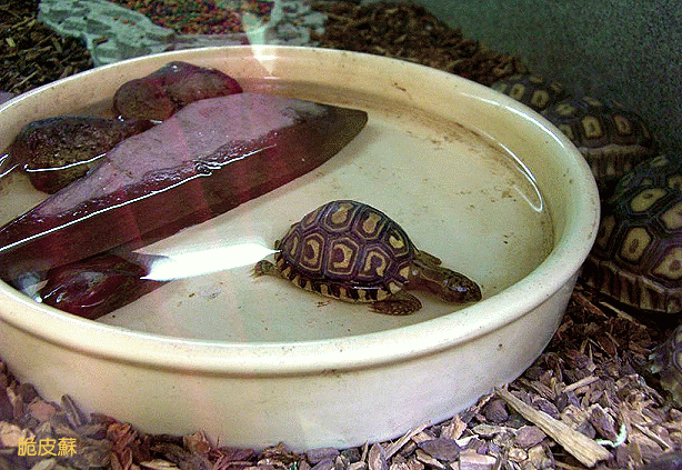 這是一隻渴到不行的小豹龜,我看他把身體埋在水裡,超過五分鐘