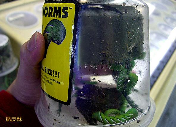 新鮮活餌,內含蟲蟲的營養補給品。蟲蟲可以長到跟我大拇指一樣大喔∼
